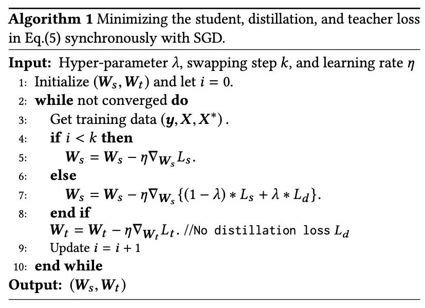 如上述损失函数的公式所示,教师模型的参数需要预先学好,这直接导致模型的训练时间加倍。一种更直接的方式是同步更新学生和教师模型,因此目标函数变成如下形式: