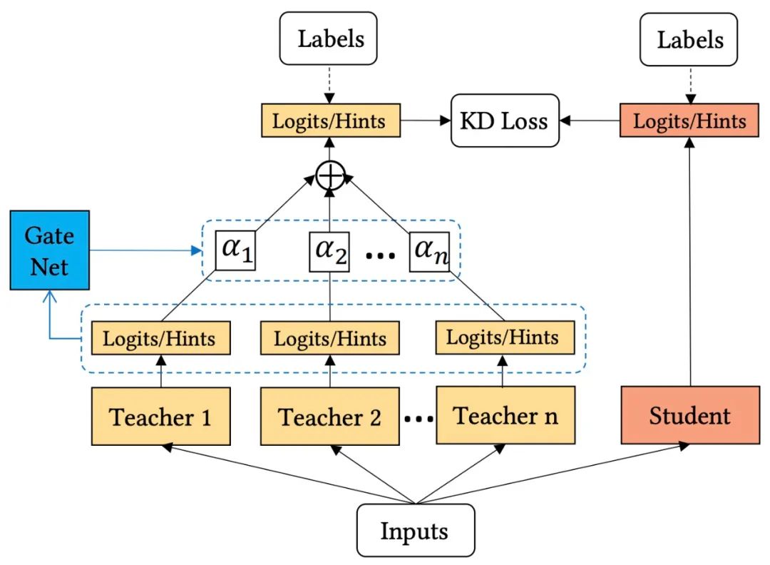和自适应不同的训练样本,作者提出了一个教师门控网络(Teacher gating network)来调整教师模型的重要性权重,从而实现按样本进行教师模型选择。更具体地说,采用softmax函数作为门控函数,计算方式如下: