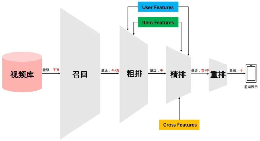 这些召回算法每路召回多少物品难以确定,因此需要加一层粗排对每路召回的结果进行统一的打分排序,把Top K 的结果送入精排中; 总体召回环节返回的物品数量太多,排序环节需要占用大量的机器资源且影响排序速度,所以可以在召回和精排之间加入一个粗排环节; 粗排一般通过少量用户和物品特征,利用简单模型,来对召回的结果进行粗略的排序,在保证一定精准的前提下,进一步减少往后传送的物品数量。粗排往往是可选择的,可用可不用,跟场景有关。之后,是精排环节,使用你能想到的任何特征,可以上你能承受速度极限的复杂模型,尽量精准地对物品进行个性化排序。排序完成后,传给重排环节,传统地看,这里往往会上各种技术及业务策略,比如曝光去重、打散、多样性保证、固定类型物品插入等等,主要是技术产品策略主导或者为了改进用户体验。