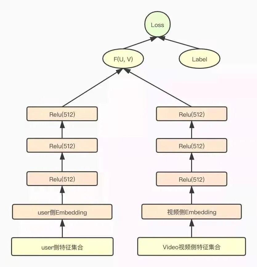 爱奇艺团队也是选择了目前主流的双塔DNN模型作为粗排模型。用户侧和Item侧分别构建三层全联接DNN模型,最后分别输出一个多维(512)的embedding向量,作为用户侧和视频侧的低维表征。粗排双塔DNN模型如下图所示: