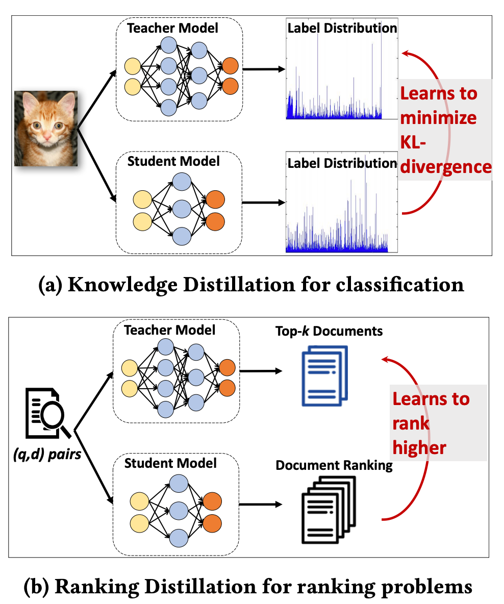 Xu C, Li Q, Ge J, et al. Privileged Features Distillation at Taobao Recommendations[C]//Proceedings of the 26th ACM SIGKDD International Conference on Knowledge Discovery & Data Mining. 2020: 2590-2598. 3.1.3 《Ranking Distillation: Learning Compact Ranking Models With High Performance for Recommender System》这篇论文是将“目标蒸馏-logits方法“应用到推荐系统领域的论文,被KDD 2018所接收。 因为是推荐和信息检索相关的论文,有一定的借鉴价值,因此也在这里给大家介绍一下。本论文提出的背景是:(1)检索系统或推荐系统中模型庞大,可以用蒸馏网络的方式提升工程效率;(2)目标是给一个query,预测检索系统的Top K相关的documents。知识蒸馏是指:给定一个输入,学生模型学习最小化Label和教师模型Soft-target的KL散度;排序蒸馏是指:给定一个query,学生模型将因其教师模型的前K个文档排名而获得更高的排名;两者区别如下图所示。