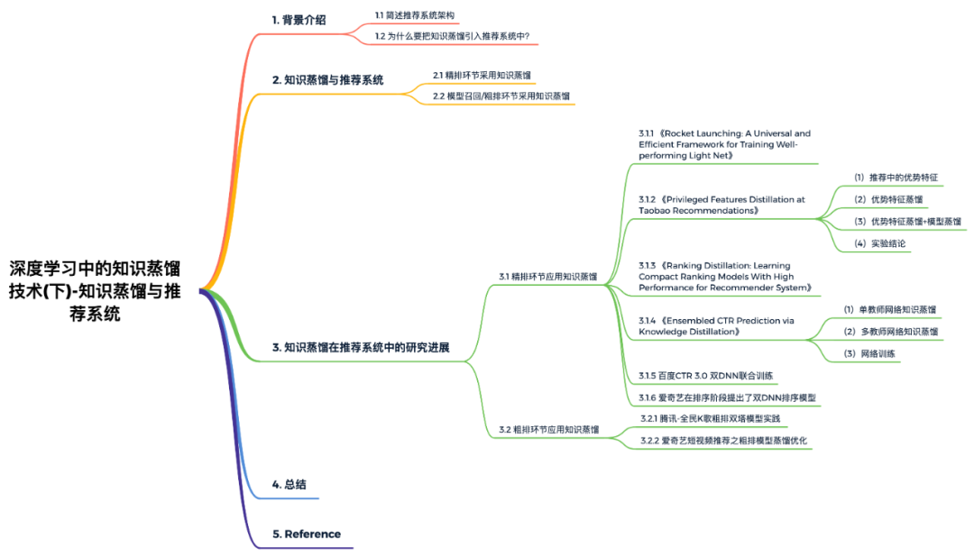 5. Reference【1】推荐系统技术演进趋势:从召回到排序再到重排 - 张俊林的文章 - 知乎 https://zhuanlan.zhihu.com/p/100019681 【2】知识蒸馏在推荐系统的应用 - 张俊林的文章 - 知乎 https://zhuanlan.zhihu.com/p/143155437 【3】知识蒸馏与推荐系统 - 凉爽的安迪的文章 - 知乎 https://zhuanlan.zhihu.com/p/163477538 【4】火箭发射:阿里巴巴的轻量网络训练方法,地址:https://github.com/Captain1986/CaptainBlackboard/blob/master/D%230034-%E7%81%AB%E7%AE%AD%E5%8F%91%E5%B0%84%EF%BC%9A%E9%98%BF%E9%87%8C%E5%B7%B4%E5%B7%B4%E7%9A%84%E8%BD%BB%E9%87%8F%E7%BD%91%E7%BB%9C%E8%AE%AD%E7%BB%83%E6%96%B9%E6%B3%95/D%230034.md 【5】火箭发射:点击率预估界的“神算子”是如何炼成的?,地址:https://mp.weixin.qq.com/s/_qZNxBDUwXZVj4hGpV6ilA 【6】KDD 2020 | 优势特征蒸馏在淘宝推荐中的应用,地址:https://mp.weixin.qq.com/s/3zpri6pfVtp-3-5_004B1Q 【7】RS Meet DL(62)-[阿里]电商推荐中的特殊特征蒸馏,地址:https://mp.weixin.qq.com/s/W309FtLGTjj6y1hFwdueHQ 【8】优势特征蒸馏(Privileged Features Distillation)在手淘信息流推荐中的应用 | KDD论文解读,地址:https://developer.aliyun.com/article/768970 【9】推荐系统遇上深度学习(九十九)-[华为]多教师网络知识蒸馏来提升点击率预估效果,地址:https://mp.weixin.qq.com/s/09O4Izf8_752db45FJ3znQ 【10】AI筑巢:机器学习在百度凤巢的深度应用。https://myslide.cn/slides/763 【11】双DNN排序模型:在线知识蒸馏在爱奇艺推荐的实践,地址:https://mp.weixin.qq.com/s/ZNjC30F28uX2lBkHBAAU3g 【12】腾讯音乐:全民K歌推荐系统架构及粗排设计,地址:https://mp.weixin.qq.com/s/Jfuc6x-Qt0rya5dbCR2uCA 【13】如何提升链路目标一致性?爱奇艺短视频推荐之粗排模型优化历程,地址:https://mp.weixin.qq.com/s/LZlskUK4dmOd5fLTZIATnQ 【14】笔记︱模型压缩:knowledge distillation知识蒸馏(一),地址:https://mp.weixin.qq.com/s/u82_7jYvfHXQaGMM_UQFBw 【15】2020年精排模型调研 - Ruhjkg的文章 - 知乎 https://zhuanlan.zhihu.com/p/335781101 【16】DSSM在召回和粗排的应用举例 - arachis的文章 - 知乎 https://zhuanlan.zhihu.com/p/350206643 【17】Instagram 推荐系统:每秒预测 9000 万个模型是怎么做到的?地址:https://mp.weixin.qq.com/s/xJ9DNxamcYAQEzaYkoSNwA