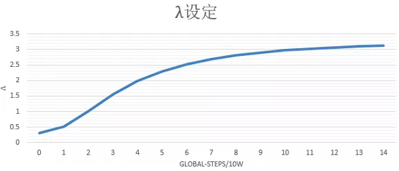 其中蒸馏loss,我们线上采用的是粗排模型输出和精排模型输出的最小平方误差,为了调节蒸馏loss的影响,我们在该项loss前又加了一维超参lamda,我们设置超参lamda随着训练步数迭代逐渐增大,增强蒸馏loss的影响,在训练后期使得粗排模型预估值尽量向精排模型对齐,lamda随着训练step的变化趋势如下图所示: