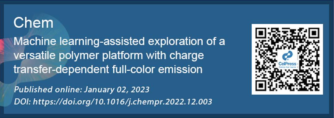 近期,来自瑞士苏黎世联邦理工学院鲍寅寅研究员团队报道了一种基于聚苯乙烯端基工程的手段来实现颜色可控的TSCT发光聚合物材料合成。该工作通过改变聚合物链长来对发射波长进行连续调控,并且由于向单受体荧光基团聚合物中引入具有可调控π-共轭程度的电子供体基团,有望得到具有简易结构的颜色可控TSCT聚合物。近期,团队基于先前研究,借助机器学习性能预测模型指导聚合物的设计,进一步发展了发射波长连续可调的聚合物合成与应用新策略。该方法通过调节供体结构以及加入比例可得到一系列结构简单的基于萘酰亚胺(NDI)以及多种多环芳香供体基团的TSCT聚合物。这一聚合物平台有望应用于高对比度光致荧光的信息加密技术。相关工作发表于Cell Press细胞出版社期刊Chem上,题为“Machine learning-assisted exploration of a versatile polymer platform with charge transfer-dependent full-color emission”。
