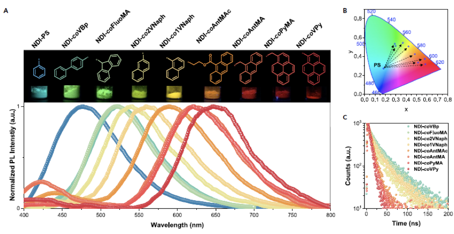 1. 苯乙烯与8种不同类型多环芳烃单体共聚。基于不同芳香基团的共轭程度,得到的NDI共聚物具有覆盖整个可见光范围且可调的固态发光;对于同种芳烃单体,共聚物的发射性质可通过单体投料比进行调节。