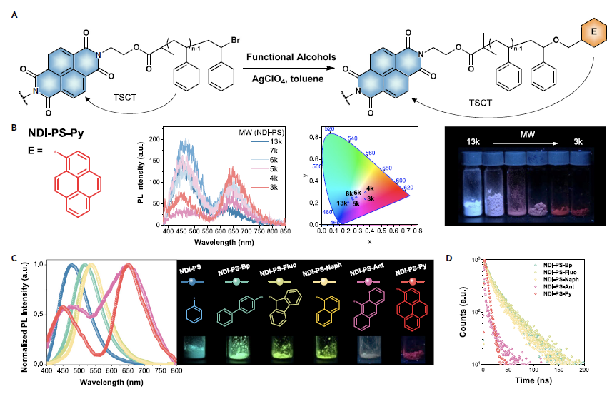 作者进一步通过端基工程向预先合成的NDI-聚苯乙烯中引入芳香功能基团,探索端基结构对NDI聚合物发射光谱的影响(图四A)。向具有不同分子量的NDI-聚苯乙烯中引入1-芘甲醇基元(PyOH),可实现NDI-PS-Py聚合物荧光从蓝色到粉色的调控(图四B)。此外,改变引入端基的多环芳烃链长,使供体-受体距离改变,产生不同程度的TSCT,实现了对所得NDI聚合物的发射光谱的调节(图四C)。