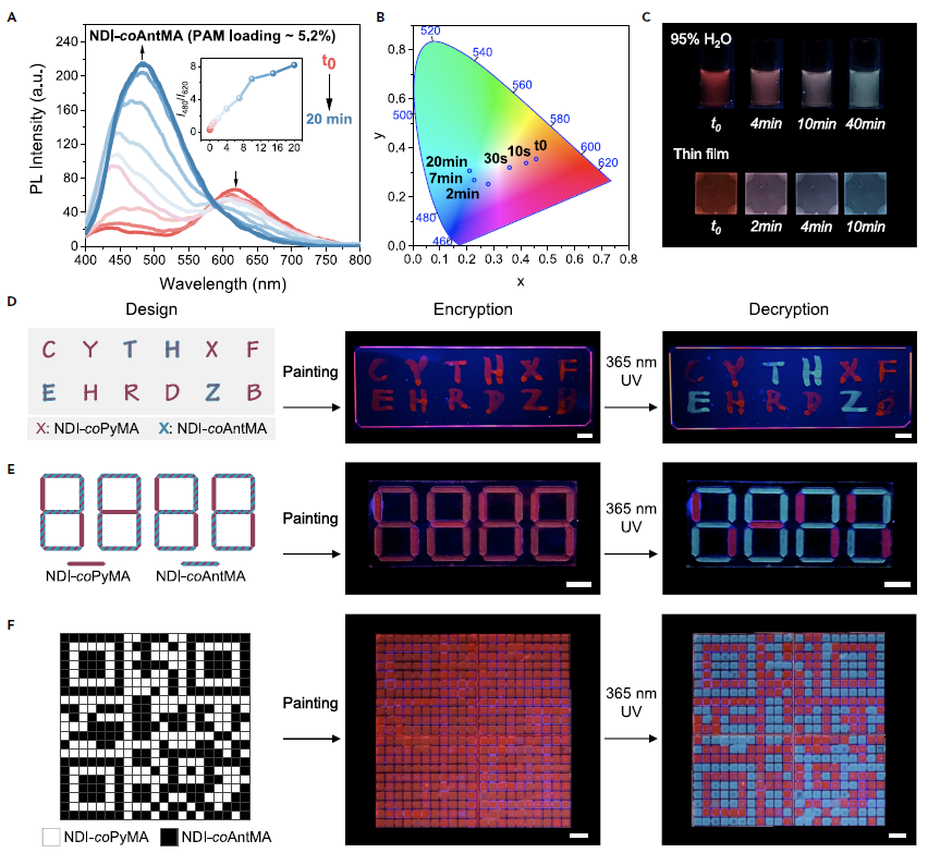 最后,基于该TSCT聚合物平台的设计灵活性和发光颜色可调控性,作者选取含蒽的供体NDI-coAntMA作为研究对象,探究其光响应性能。当蒽单体载量为5.2%时,紫外光照射下,初始的620 nm处发射峰逐渐消失,而480 nm处的发射峰强度显著增强,直到20分钟后发射光谱中只有蓝光发射峰(图五 A-C)。这种肉眼可见的颜色变化可应用于开发信息加密材料,并可拓展至字母、数字以及二维码等应用场景(图五 D-F)。