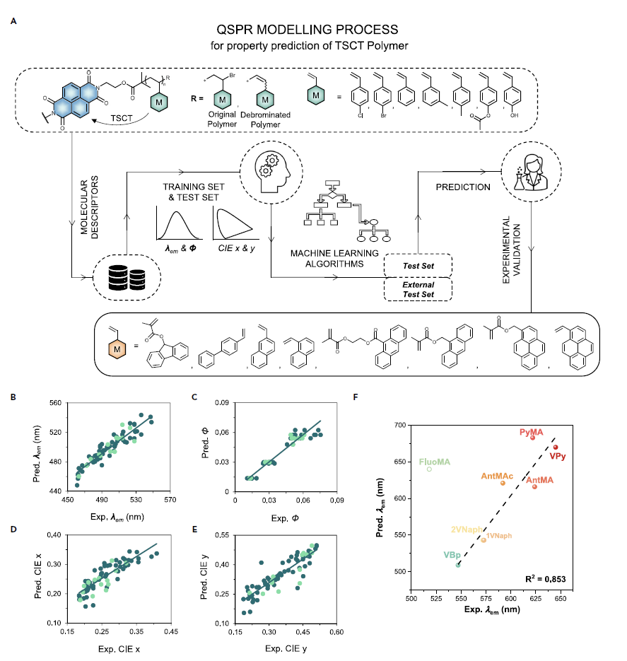▲图一:机器学习指导荧光聚合物的合成以及预测结果与实验结果对比