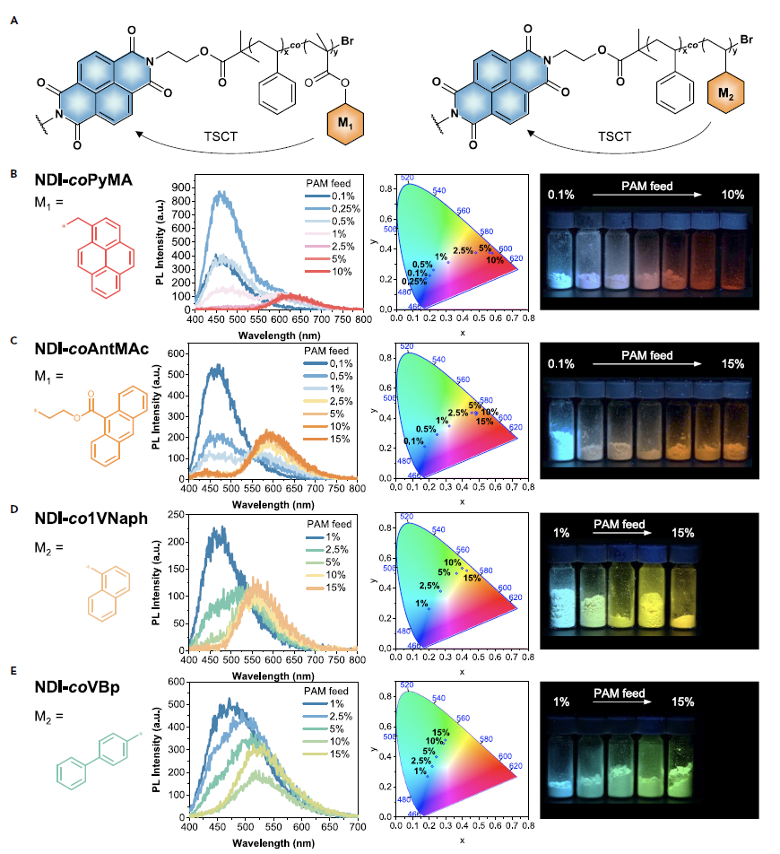 为了降低多环芳烃单体基元间的π-π堆积,且保证其与NDI间实现能量转移,研究人员将多环芳烃单体与苯乙烯进行共聚,通过改变单体投料比,得到一系列NDI基共聚物(图二A)。当PyMA占比为0.1%时,NDI-coPyMA在460 nm处有一单一发射峰。随着PyMA投料比逐渐增加,该发射峰的强度降低,同时低波数区域出现一发射峰,且强度随之增加。当PyMA占比为10%时,蓝光发射峰完全消失,仅有648 nm处的红光发射峰,与NDI-polyPyMA的发射峰位置相近。该结果表明,共聚策略是一种有效且方便的可调TSCT发射手段,对于发光颜色的调控可通过改变多环芳烃单体比例实现(图二B)。此外,对于其他共聚物,如NDI-coAntMA等,均可通过改变共聚时的投料比来对所得共聚物发射光谱进行连续调节(图二C-E)。值得注意的是,TSCT诱导的发射仅能在聚集态中被观测到,进一步说明了TSCT仅会在供体与受体空间上接近时发生。