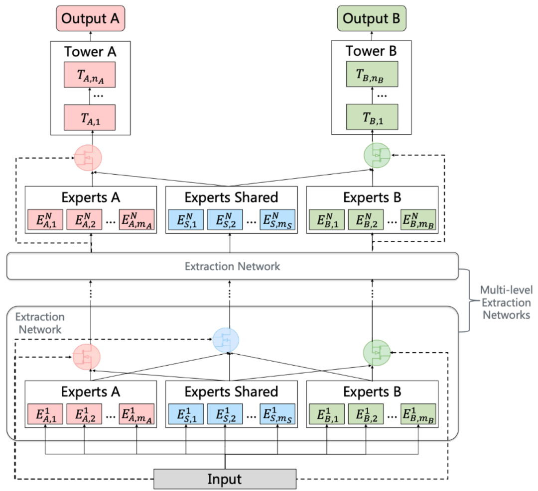 PLE 针对前面的第二个问题,在 CGC 的基础上,PLE 考虑了不同的 Expert 之间的交互,可以看作是 Customized Sharing 和 ML-MMOE 的结合版本,模型结构如下图所示: