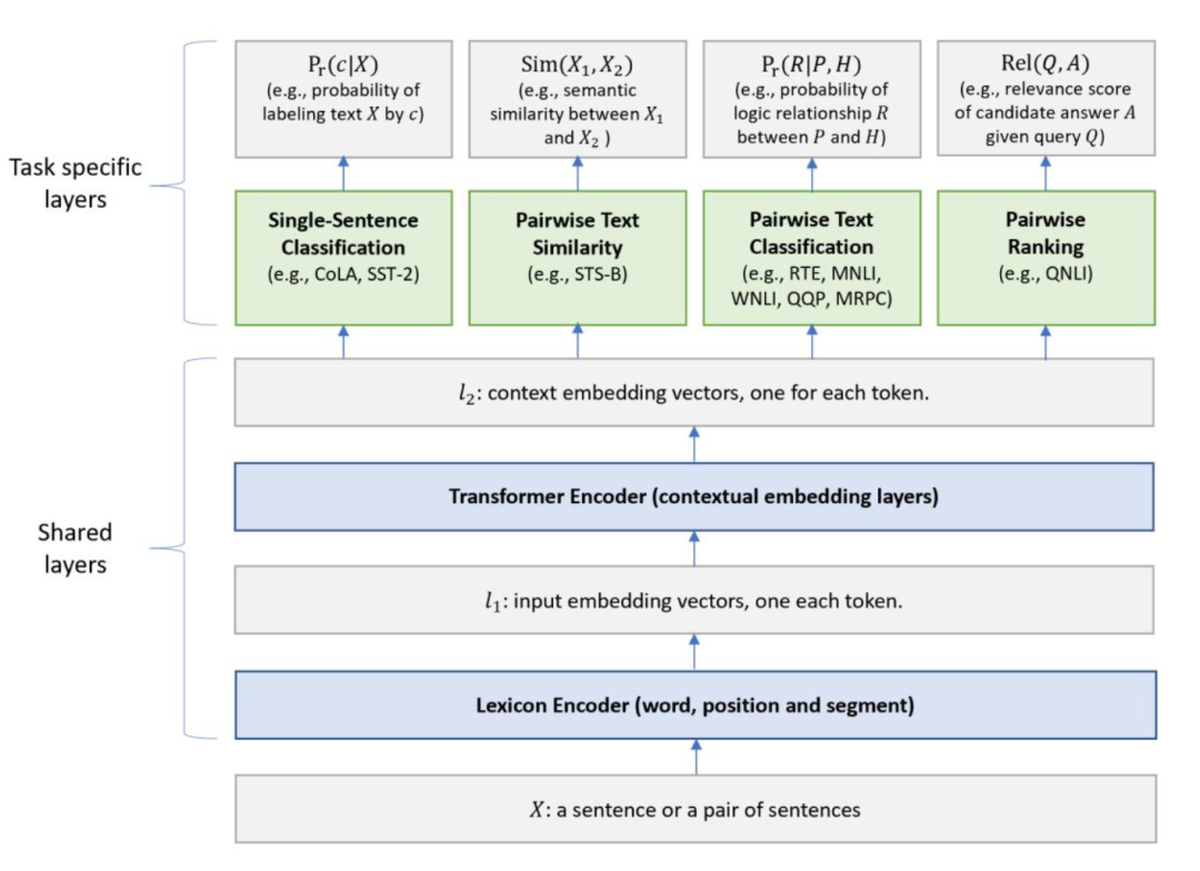 Lexicon Encoder :输入一个句子(一个句子对),遵循 BERT 的输入,添加 [CLS]、[SEP] 等标签,并加入word、segment 和 position representation;Transformer Encoder :与 BERT 一样使用多层 Transformer 模型;特定任务部分;
