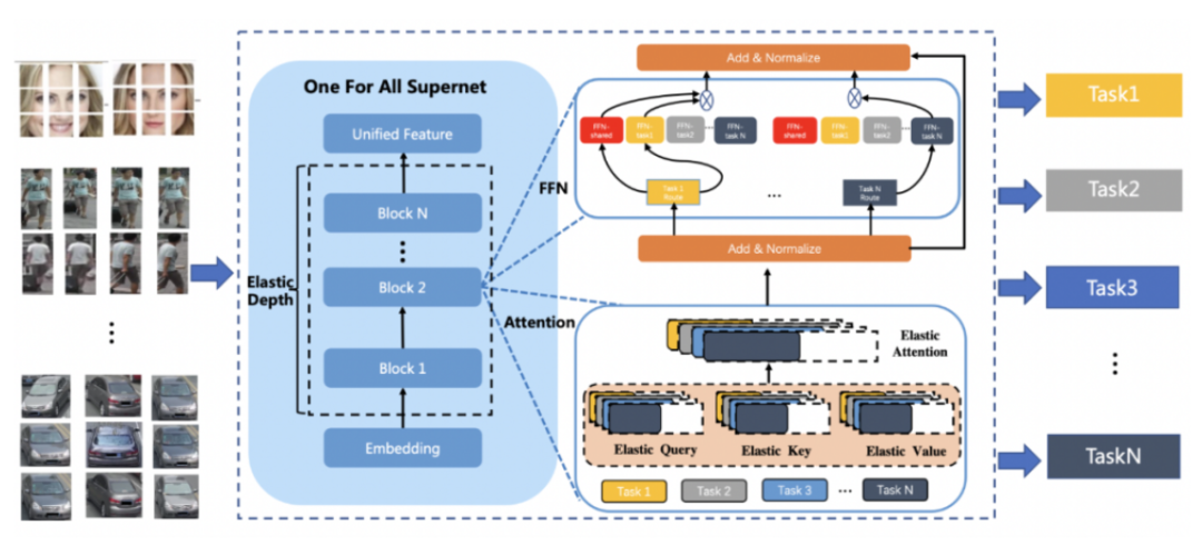 UFO 综合了硬参数共享和软参数共享的方式,基于 Vision Transformer 结构设计了多任务多路径超网络。与谷歌 Switch Transformer 以图片为粒度选择路径不同,UFO 以任务为粒度进行路径选择,这样当超网络训练好以后,可以根据不同任务独立抽取对应的子网络进行部署,而不用部署整个大模型。UFO 超网中不同的路径可以选择不同 FFN 单元,多路径 FFN 超网模块,每个任务都有两种不同的路径选择,即选择共享 FFN(FFN-shared)或者专属 FFN(FFN-task)。
