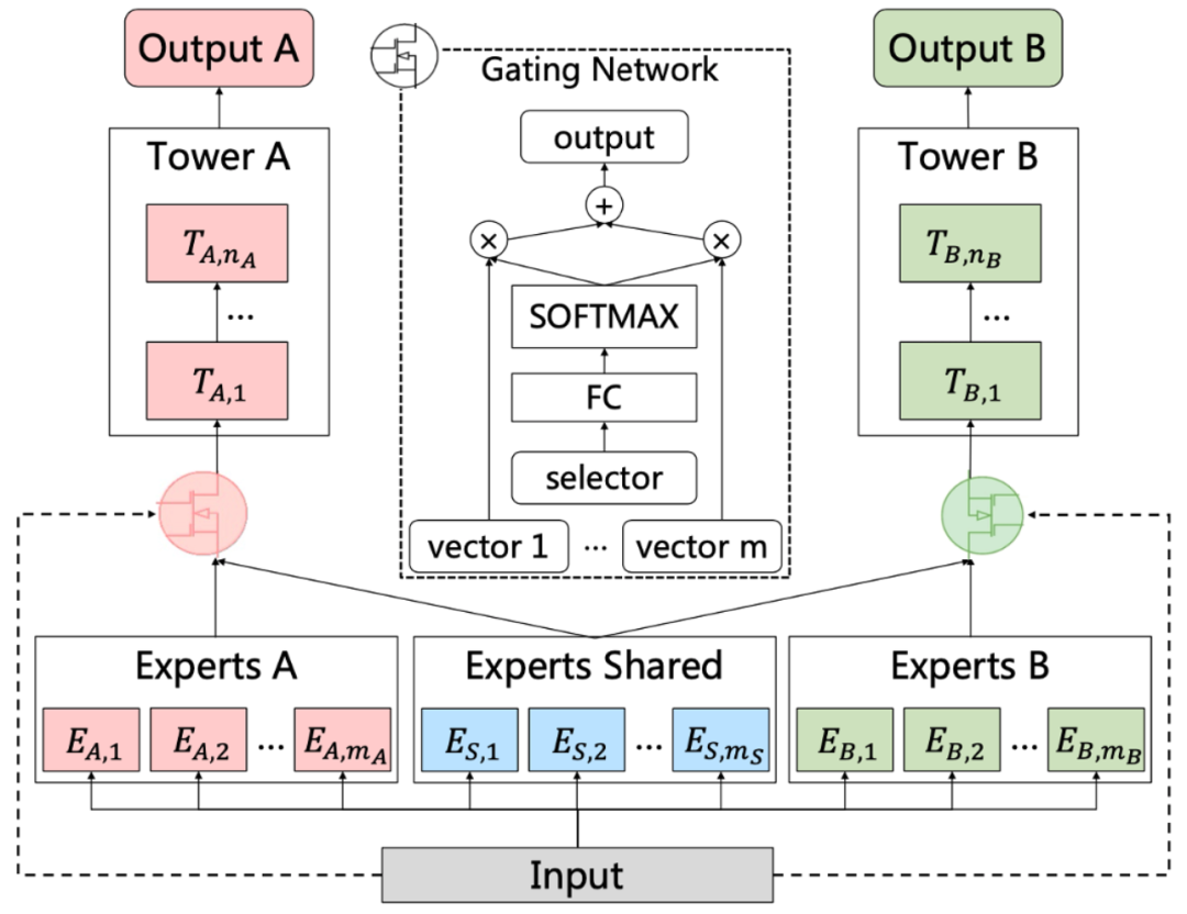 如上图所示。CGC 可以看作是 PLE 的简单版本,所以先对其进行介绍。CGC 可以看作是Customized Sharing 和MMOE 的结合版本。对任务A来说,将 Experts A 里面的多个 Expert 的输出以及 Experts Shared 里面的多个 Expert 的输出,通过类似于 MMOE 的门控机制之后输入到任务A的上层网络中。