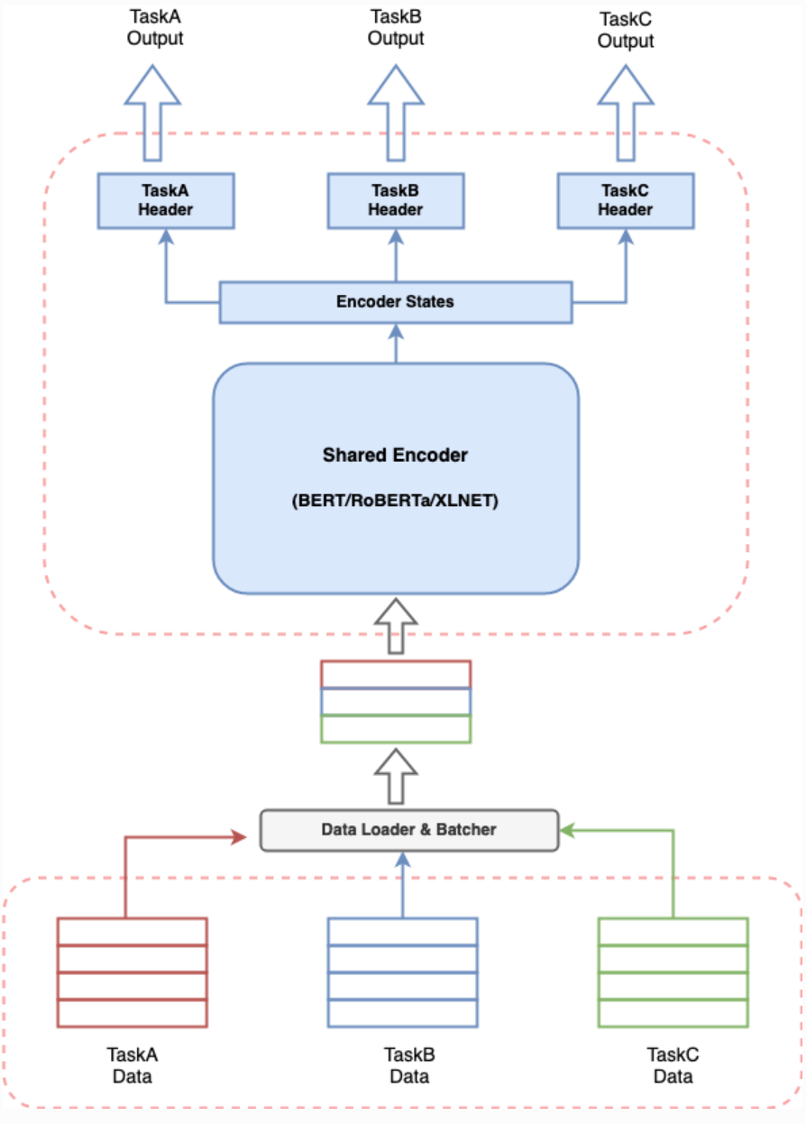 multi_task_NLP 整体框架与 MT-DNN 相似,共享了 Encoder 部分的向量信息,在输出部分,通过不同的 Header 区分不同任务,使您能够一起定义多个任务,并训练一个同时学习所有已定义任务的模型。这意味着可以执行多个任务,其延迟和资源消耗相当于单个任务。