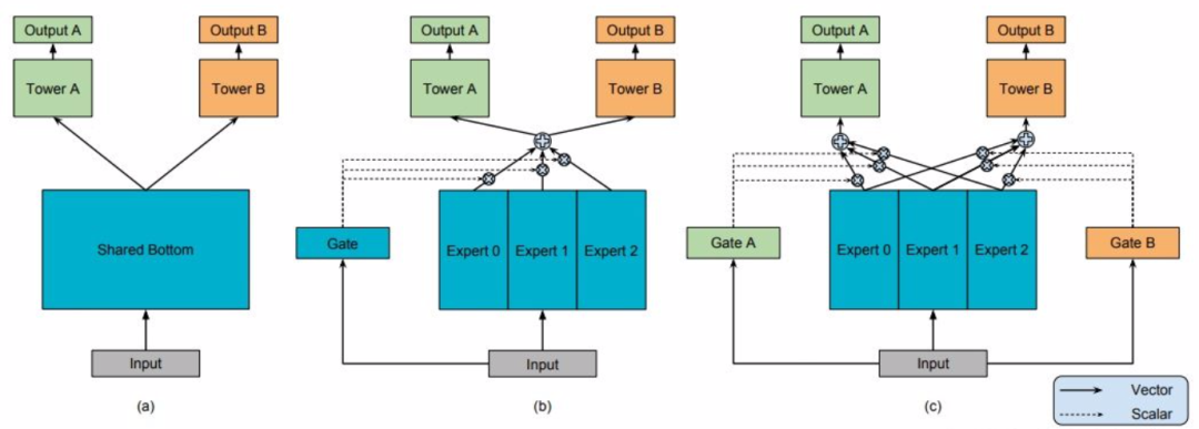 MMOE结构 MMOE[3] 模型结构(下图 b 和 c)和最左边(a)的硬参数共享相比,(b)和(c)都是先对Expert 0 - 2(每个 expert 理解为一个隐层神经网络就可以了)进行加权求和之后再送入 Tower A 和 B(还是一个隐层神经网络),通过 Gate(还是一个隐藏层)来决定到底加权是多少。另外 MMOE 在 MOE 的基础上,多了一个 GATE,意味着:多个任务既有共性,也必须有自己的独特性。