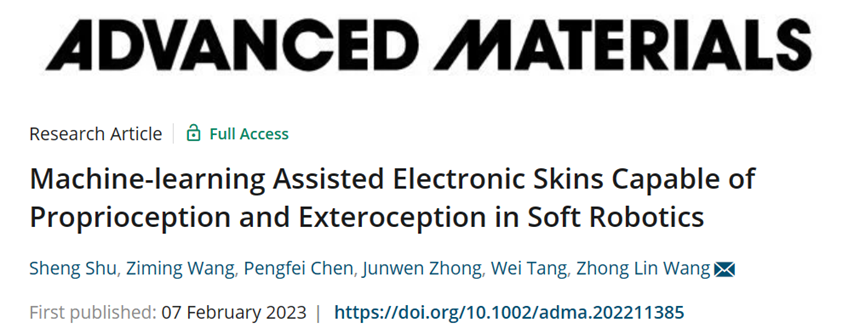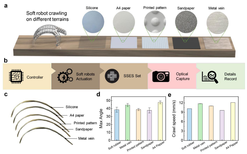 中国科学院北京纳米能源与系统研究所王中林院士、唐伟研究员等人提出了一种基于差分压电矩阵的形状感应电子皮肤(SSES),其能通过集成机器学习技术来获得具有本体感知和外体感知能力的软体机器人。基于SSES收集到的数据,软体机器人能在爬行过程中重建表面构象,精度达到0.0025°,响应时间36 ms,并兼容绝大部分软体机器人的应用场景。此外,基于获得的形状变化,作者建立了一个动态模型,可以进一步推断爬行距离、手势和速度以进行调制和校准。例如,软体机器人可以识别各种地形或障碍物,从而展现出先进的人工智能。这项工作为增强和多样化软机器人实际应用的能力提供一种通用方法。该研究以题为“Machine-learning assisted electronic skins capable of proprioception and exteroception in soft robotics”的论文发表在《Advanced Materials》上。