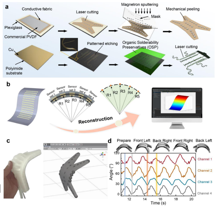软体机器人由于其固有的柔软性,被认为是弥合机器和生物体之间差距的有希望的候选者。作为可以容纳多模态传感器甚至是传感器阵列的综合平台,电子皮肤技术是增强软体机器人能力的有效策略。然而,目前电子皮肤的研究主要涉及外部刺激的感知(外体感知),鲜有研究关注软体机器人形状的实时监测(本体感知)。因此,开发出能够重建形状并同时对周围环境做出反应的电子皮肤,对于软体机器人功能的多样化具有重要意义。