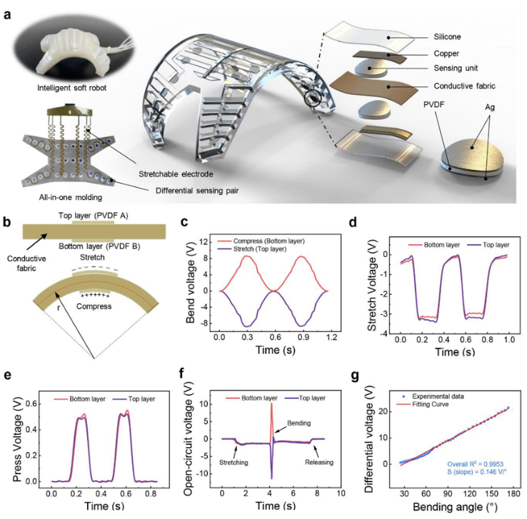 SSES采用分层结构,相对于导电织物层呈现镜像对称。该层还作为公共接地电极,两侧放置两个压电传感单元。每个单元由夹在两个Ag电极之间的PVDF薄膜组成,最后整个器件由最外层的硅层封装。作者采用差分方法来最大程度地减少传感过程中的干扰。夹层结构的另一个显着优点是其信号幅度的明显改善,与单层结构相比,其峰值高14倍。SSES的极限分辨率可以达到0.0025°,并且可以通过采用更灵敏的信号采集系统或开发具有更高压电特性的材料来进一步提高。此外,SSES还展示了快速响应特性(36 ms)、长周期稳定性以及对其他常见影响的鲁棒性,这些优点确保了它在软机器人领域的广泛应用。
