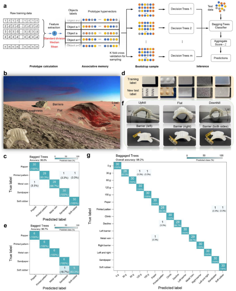 软体机器人四肢弯曲状态的变化不仅引入了构象的变化,而且表明它们与周围环境的物理相互作用。作者通过SSES收集的数据来感知周围的环境。首先,集成SSES的软体机器人在五个不同的地形上爬行。然后,对SSES收集的信号进行统计分析,并与光学图像的差异进行比较。尽管软体机器人在爬行过程中的五个轮廓总体上呈现出相似的形状,但逐帧光学图像显示,在爬行过程中四个肢体存在角度差异。这可以解释为表面粗糙度越大,抵抗机器人弯曲变形的摩擦力越高。此外,这种现象得到了爬行速度差异的支持,其中在A4纸上获得最快的爬行速度,而在软橡胶或砂纸上的速度要慢得多。爬行过程中的这些细节差异使作者能够开发出一种基于SSES的快速可靠的策略来识别不同的地形。作者采用机器学习技术来进一步利用SSES获取的数据实现软体机器人的环境意识。通过一系列统计数据结合机器学习技术,软体机器人可以识别出五种不同粗糙度值的地形,准确率高达98.0%。与地形的粗糙度类似,不同的重量载荷、倾斜度和障碍物会引起传感信号的相应变化,这意味着使用机器学习来识别这些参数是可行的。结果表明,软体机器人可以识别上坡或下坡方向坡度为10°的道路,准确率为 97.8%;可以识别道路上障碍物的位置;可以识别所携带物品的数量。此外,为了探索对环境的综合感知,作者在识别测试中混合了所有20种地形/障碍物/负载条件。结果显示总体准确率为98.2%。且使用深度神经网络或增加数据丰富度以获得更多关于环境的信息有望进一步改进该模型。总结:作者开发了一种形状感应电子皮肤(SSES)来感应软体机器人在运行过程中的动态状态。具体而言,作者首先开发了一种通用策略,用于根据SSES获得的数据重建软体机器人的表面构象,从而实现软体机器人的本体感受能力。此外,作者引入机器学习技术来分析SSES生成的数据,以识别不同的地形和障碍物,从而赋予软体机器人外部感受能力和初级智能。这项工作为软体机器人有效地获取自身状态并以复杂的方式与环境交互奠定了基础。--纤维素推荐--