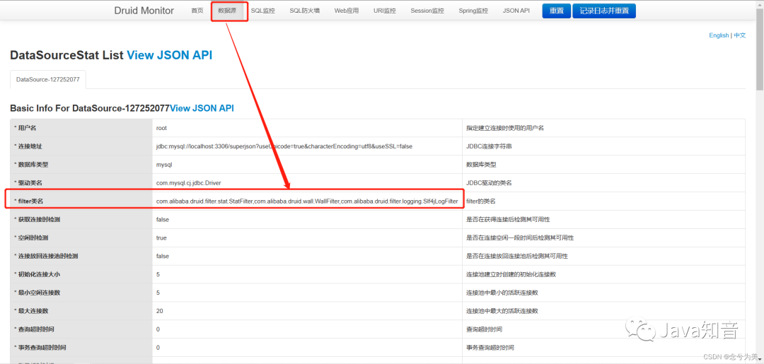 - 数据源页面 是当前DataSource配置的基本信息,上述配置的Filter可以在里面找到,如果没有配置 Filter(一些信息会无法统计,例如SQL监控会无法获取JDBC相关的SQL执行信息)