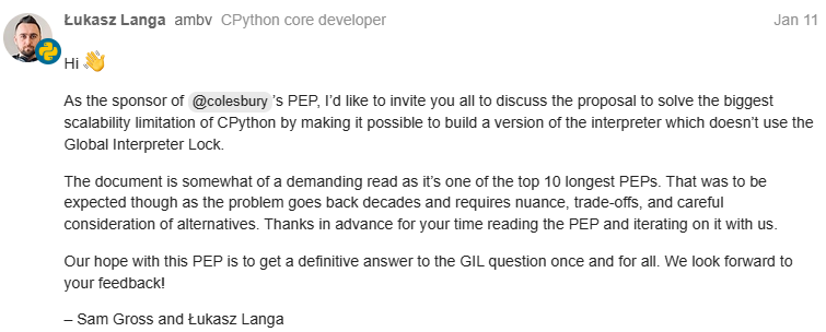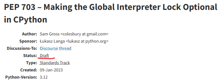 PEP-703 的讨论而 PEP-703 有 PSF 首位全职开发者 Łukasz Langa 的倾力支持,社区的反响也不错,我觉得它今后落地的希望也挺大!
