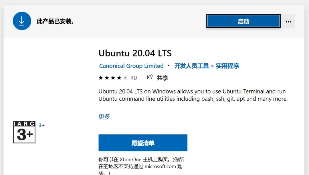 2 安装Ubuntu子系统从应用商店安装Ubuntu系统,这个系统将会以软件的形式存在。我这里选择的是LTS版本,可以看到给它打分的人并不多,可能大多数都是像我一样没有微软账号的游客。