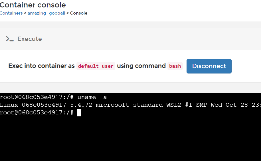 点击小箭头,可以直接在web上进入Docker虚拟环境的命令行终端,非常的方便。如果你平常要调研的额软件和中间件非常的多,想要快速体验它的功能效果,这不得不说是个非常好用的功能。