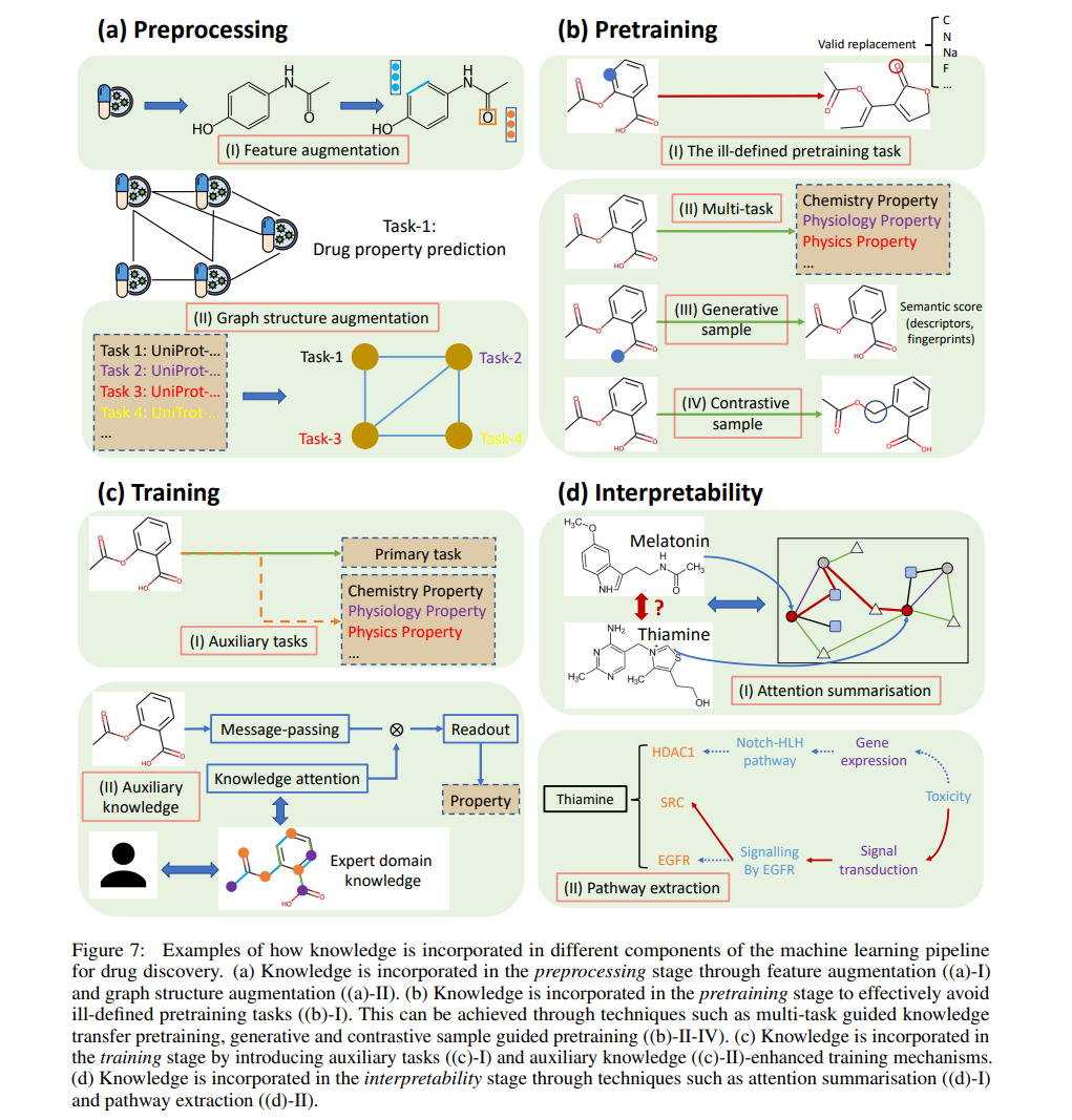 4.3节介绍了它们在药物发现中的重要应用。然而,某些重大的局限性,如依赖显式的图结构和丰富的训练信号、受限的理论表达能力和缺乏可解释性,阻碍了它们在现实中的应用[16,116]。今天,外部生物医学知识被广泛地与GML方法结合起来,以更有效地进行药物发现和开发。本文将这种新机制命名为知识增强图机器学习(简称KaGML),到目前为止,它在以下方面表现出了有希望的结果:(i)实现更精确的药物发现(第5.1-5.3节);(ii)灵活使用非结构化训练数据(第5.1-5.2节);(iii)有效处理有限的训练数据(第5.2-5.3节);(iv)自动生成有意义的解释(第5.4节)。