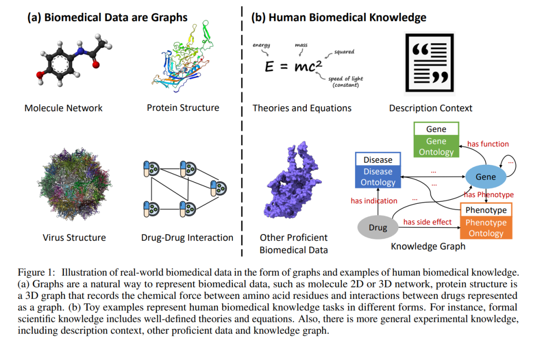 为了减少财政负担和提高成功率,研究人员一直致力于通过利用卓越的人工智能(AI)技术来加速药物发现[7,8,9,10,11]。现在的技术进步允许在基因组学、蛋白质组学和成像等领域创建大量数据,这些数据可用于告知药物发现过程[9,12]。人工智能可以分析这些数据,并识别在其他情况下可能不引人注意的模式和关系,从而识别新目标并优化现有目标[13,8]。基于人工智能的药物发现也被用于通过预测候选药物成功的可能性来简化药物开发过程,减少将新药推向市场所需的时间和成本[10,14]。此外,人工智能被用于预测潜在的副作用和毒性,以便在临床试验之前识别潜在的安全问题[15,11]。随着这些进步,人工智能有可能改变药物发现过程[7],使药物开发更快、更有效,并更快地为患者带来新疗法。生物医学数据是高度互联的[16,17],可以很容易地表示为图(或网络),在药物发现和开发过程的不同阶段具有各种应用。例如,如图1-(a)所示,生物医学数据可以层次地表示为图形。从分子水平开始,原子可以表示为节点,化学键表示为(2D或3D)分子图的边[18,19]。在大分子水平上,氨基酸残基(节点)之间的相互作用(边)以(2D或3D)蛋白质图的形式组织[20,21]。在化合物水平上,药物-药物相互作用(DDI)网络中的边可以指示通过长期临床筛查测量的药物(节点)之间的化学相互作用(边)[22,23]。