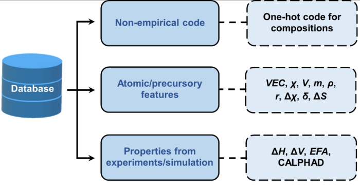 高熵陶瓷描述符(特征)可以根据其获取的难易程度分为三类。第一类为非经验特征,如独热码。该类特征不包含陶瓷材料的物理特性。第二类为原子/前驱体特征。该类特征不需要额外的实验与模拟即可获取,但包含一定的物理意义。第三类为通过实验或模拟获得的特征信息。该类特征成本高昂,不适合用来作为输入,而可以用来作为模型的输出。