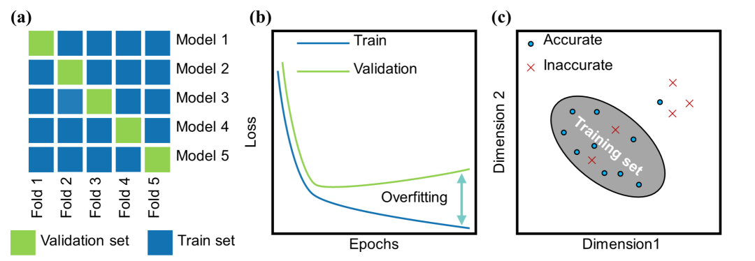 图 5 五折交叉验证、过拟合和模型高精度预测区域(模型舒适区)的示意图。由于缺乏高质量数据库,已发表文章使用的数据集通常比较小。在这种情况下,数据集分割可能对模型的训练及预测产生比较显著的影响。为此,现有高熵陶瓷机器学习往往采用交叉验证的方法训练模型。在训练过程中,训练损失将随着迭代轮数的增加而降低,而验证损失一般高于训练损失。二者之间的差值是由过拟合导致的。由于数据集在相空间中的分布不均一,模型对各个组分的关注程度也不同。因此,训练好的模型往往存在一个“舒适区”,在“舒适区”内,模型表现良好;而在该区域外,应当审慎地理解模型预测结果。