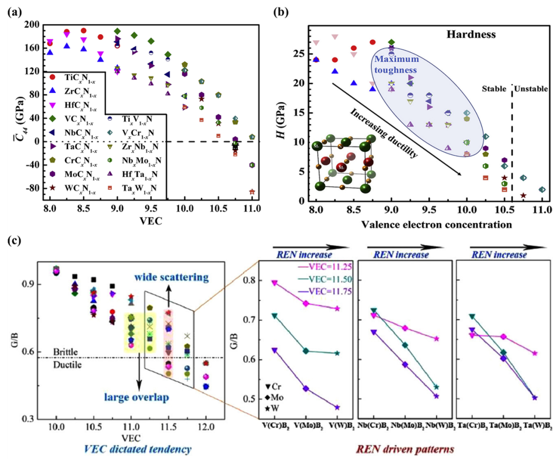 对于非高熵体系(金属元素种类低于三),陶瓷材料的价电子浓度与材料的各项性能高度相关。如弹性常数、硬度和G/B比值均随VEC的增加而降低。