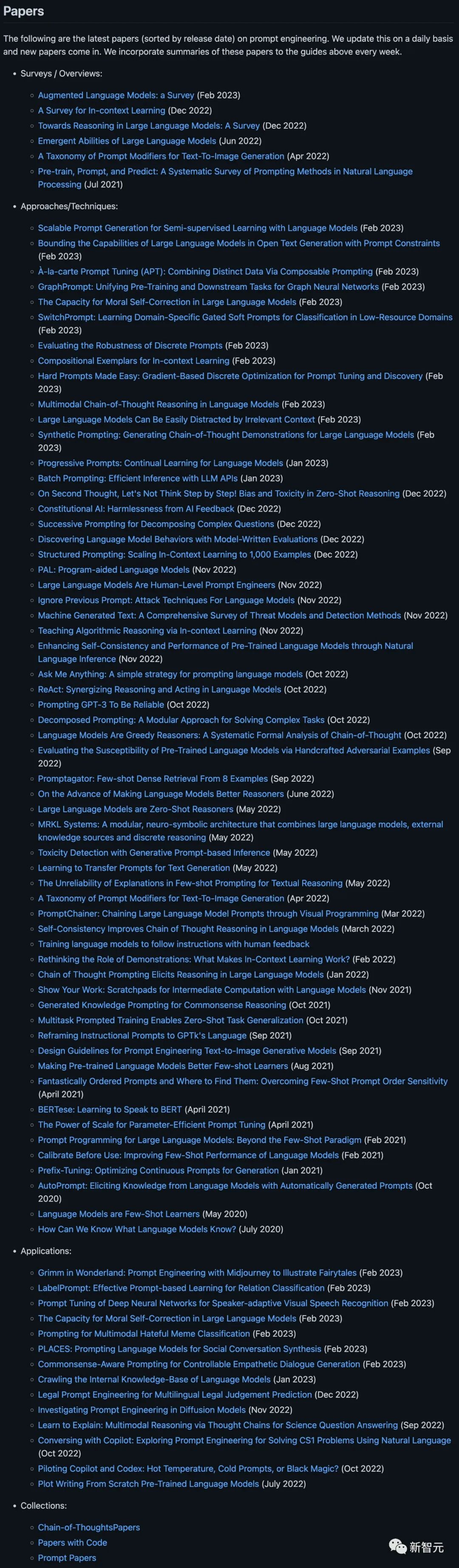 团队每天都会更新有关提示工程的最新论文,并且每周都会将这些论文的摘要纳入上述指南中。比如,LeCun今年2月的新作「Augmented Language Models: a Survey 」就被收录了进来。