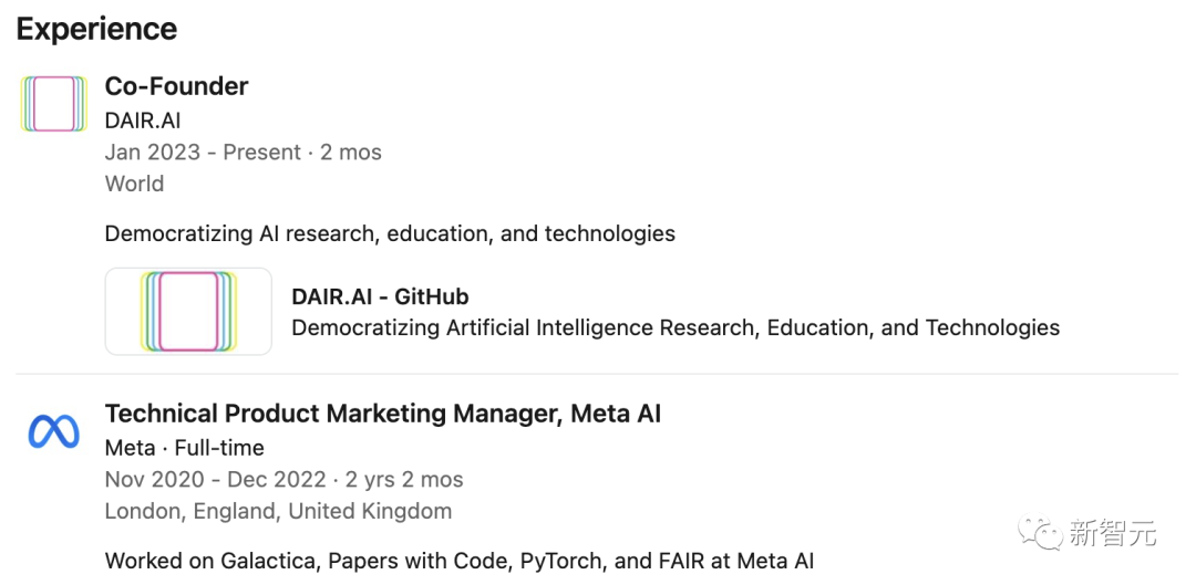 他在台湾清华大学取得了信息系统与应用的硕士和博士学位。在此之前,他在Meta AI担任了2年技术产品营销经理,并曾是NeurIPS研讨会和NAACL 2019的程序委员会的成员。从Linkedin上的经历来看,这位朋友似乎也曾负责过LeCun一直心心念的Galactica。https://github.com/dair-ai/Prompt-Engineering-Guide