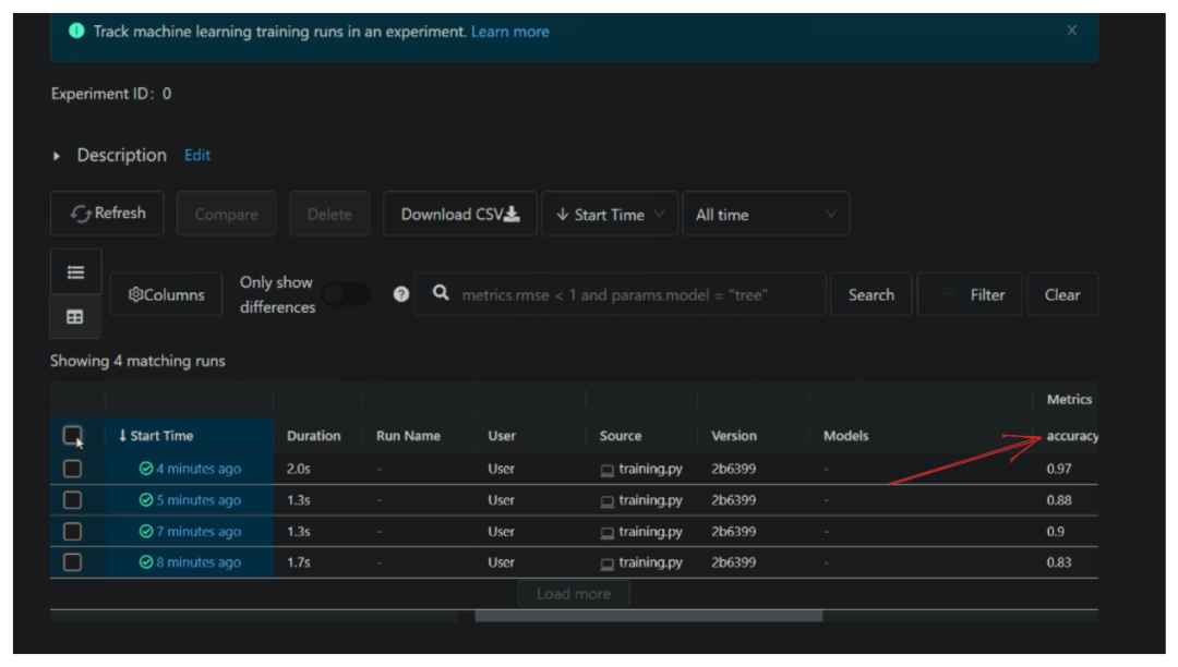 并且,在完成实验后,终端上运行:mlflow UI,它会弹出一个实验记录的仪表板,其中包含用于对实验结果进行筛选和可视化的控件: