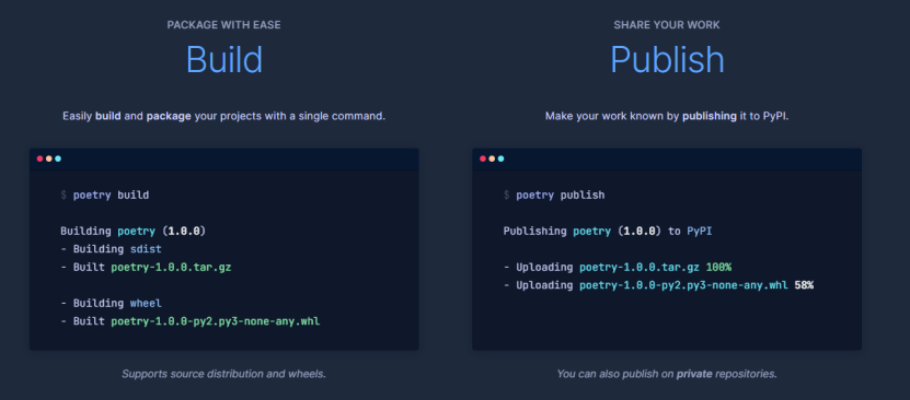 您还可以用pyproject.toml配置文件配置你的python项目,Poetry将负责虚拟环境,使用简单的命令构建存储库并将其发布到PyPI。