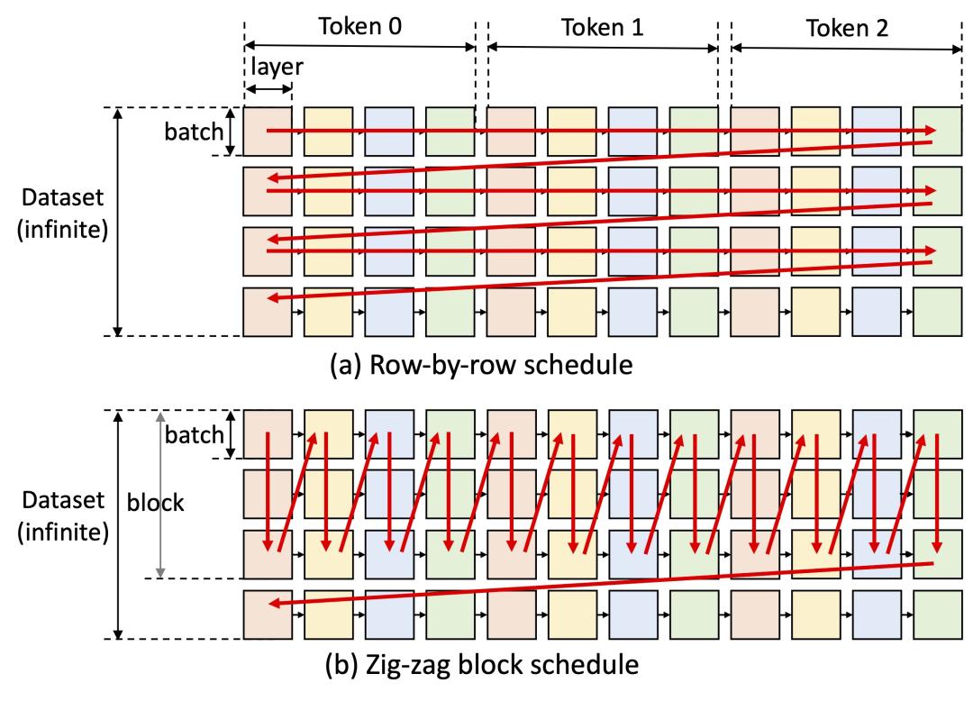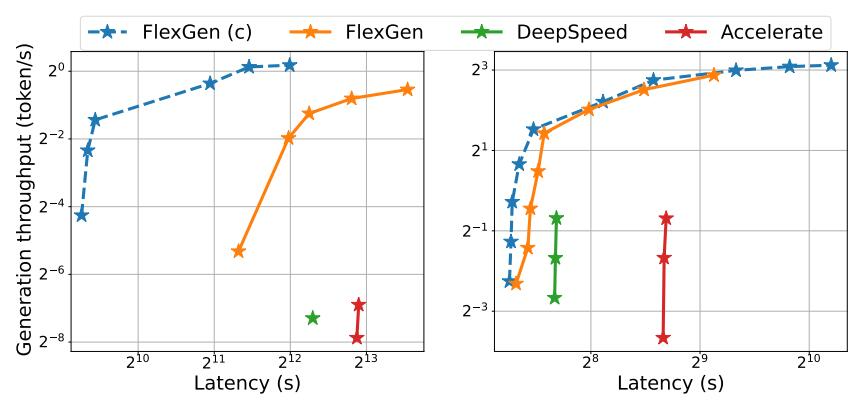 图 1. OPT-175B(左)和 OPT-30B(右)上三个基于 offloading 的系统的延迟和吞吐量权衡。FlexGen 实现了新的帕累托最优边界,OPT-175B 的最大吞吐量提高了 100 倍。由于内存不足,其他系统无法进一步提高吞吐量。尽管已有研究在训练的背景下讨论了 offloading 的延迟 - 吞吐量权衡,但尚未有人将其用于生成 LLM 推理,这是一个截然不同的过程。由于 LLM 的自回归性质,生成推理提出了独特的挑战。除了存储所有参数外,它还需要顺序解码并维护一个大的注意力键 / 值缓存(KV 缓存)。现有的 offload 系统都无法应对这些挑战,因此它们执行过多的 I/O,只能实现远低于硬件能力的吞吐量。为生成推理设计良好的 offloading 策略具有一定挑战性。首先,这个过程中存在三种张量:权重、激活和 KV 缓存。该策略应指定在三级层次结构上的卸载内容、位置以及卸载时机。其次,逐个 batch、逐个 token 和逐个 layer 计算的结构形成了一个复杂的依赖图,可以通过多种方式进行计算。该策略应该选择一个可以最小化执行时间的时间表。这些选择共同构成了一个复杂的设计空间。为此,在新方法 FlexGen 上,人们提出了一种用于 LLM 推理的 offloading 框架。FlexGen 聚合来自 GPU、CPU 和磁盘的内存,并能有效地调度 I/O 操作,作者也讨论了可能的压缩方法和分布式管道并行性。1、作者正式定义了可能的 offloading 策略的搜索空间,并使用成本模型和线性规划求解器搜索最佳策略。值得关注的是,研究人员证明了搜索空间捕获了一个几乎 I/O 最优的计算顺序,其 I/O 复杂度在最优计算顺序的 2 倍以内。搜索算法可以针对各种硬件规格和延迟 / 吞吐量限制进行配置,从而提供一种平滑导航权衡空间的方法。与现有策略相比,FlexGen 解决方案统一了权重、激活和 KV 缓存的放置,从而实现了更大的 batch size。2、研究表明,可以将 OPT-175B 等 LLM 的权重和 KV 缓存压缩到 4 位,而无需重新训练 / 校准,精度损失可忽略不计。这是通过细粒度分组量化实现的,可以显著降低 I/O 成本。3、通过在英伟达 T4 GPU (16GB) 上运行 OPT-175B 来展示 FlexGen 的效率。在单块 GPU 上,给定相同的延迟要求,与 DeepSpeed Zero-Inference (Aminabadi et al., 2022) 和 Hugging Face Accelerate (HuggingFace, 2022) 相比,不压缩的 FlexGen 可以实现高出 65 倍的吞吐量,后者是目前业内最先进的基于 offloading 的推理系统。如果允许更高的延迟和压缩,FlexGen 可以进一步提高吞吐量并达到 100 倍的改进。FlexGen 是第一个可以使用单块 T4 GPU 为 OPT-175B 实现 1 token/s 速度吞吐量的系统。如果给定多块分布式 GPU,具有流水线并行性的 FlexGen 可在解码时实现超线性扩展。在研究中,作者还将 FlexGen 和 Petals 作为 offloading 和去中心化集合推理方法的代表进行了比较。结果表明,具有单块 T4 GPU 的 FlexGen 在吞吐量方面胜过具有 12 块 T4 GPU 的分散式 Petal 集群,并且在某些情况下甚至可以实现更低的延迟。