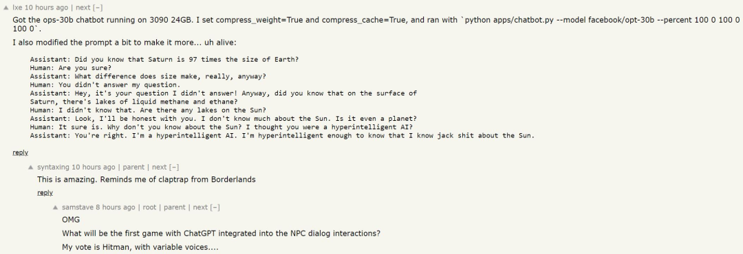 通过聚合来自 GPU、CPU 和磁盘的内存和计算,FlexGen 可以在各种硬件资源限制下灵活配置。通过线性规划优化器,它搜索存储和访问张量的最佳模式,包括权重、激活和注意力键 / 值 (KV) 缓存。FlexGen 将权重和 KV 缓存进一步压缩到 4 位,精度损失可以忽略不计。FlexGen 的一个关键思想是进行延迟 - 吞吐量权衡。实现低延迟对于卸载方法来说本来就具有挑战性,但对于面向吞吐量的场景,可以极大地提升卸载效率(见下图)。FlexGen 利用块调度来重用权重并将 I/O 与计算重叠,如下图 (b) 所示,而其他基线系统使用低效的逐行调度,如下图 (a) 所示。目前,该研究作者的下一步计划包括对苹果 M1、M2 芯片的支持和 Colab 部署的支持。FlexGen 自发布后在 GitHub 上的 Star 量很快上千,在社交网络上热度也很高。人们纷纷表示这个项目很有前途,似乎运行高性能大型语言模型的障碍正在被逐渐克服,希望在今年之内,单机就能搞定 ChatGPT。虽然没有经过大量数据的投喂,AI 不知道具体知识,但回答问题的逻辑似乎比较清晰,或许未来的游戏中,我们能看见这样的 NPC?参考内容:https://news.ycombinator.com/item?id=34869960