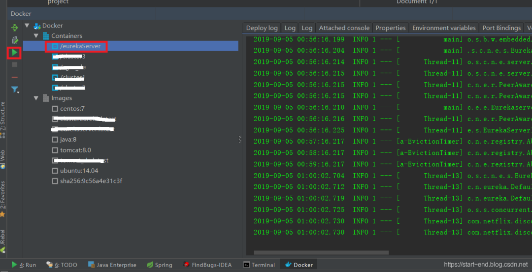 我们可以看到在docker插件中,多出了一个eurekaServer的容器,并且启动成功,端口号为9090.