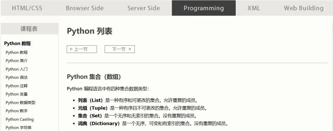 推荐理由:一本感觉基本上没有太多缺点的书,对于有R语言基础的同学,其实这本书就像是R语言实战一样不足:这本书也有很多小伙伴会称呼为python从入门到入土,也是从侧面说明了,这本书其实也是比较枯燥的笔者感受:笔者倒是把这本书看完了,里面关于python的知识是非常具有体系,尽管看到一半略显枯燥,但是坚持下来会有不一样的感觉,然后这本书在网络上也有电子版本,并且强烈推荐根据电子版本可以找到这本书配套的代码以及阅读计划,可以按照阅读计划来看这本书(貌似是3周)推荐理由:我可以说这个界面我觉得比较适合我吗QAQ,开个玩笑,知识比较全面的同时,界面布局笔者比较喜欢,同时没有太多的文字,基本上都是通过代码来讲解知识,觉得适合有一定程度基础的同学不足:因为文字比较少,所以可能需要有一定程度的代码水平(R和python都可以,因为学到现在,笔者感 觉,计算机语言在一定程度上都彼此互通)笔者感受:这个网站笔者一般都是用来当作自己的笔记,因为有些东西好久不用,基本上也快忘记了,所以 这个网站文字也比较少,很方便可以当作一个小笔记来进行使用网站:Python 列表 (w3school.com.cn)