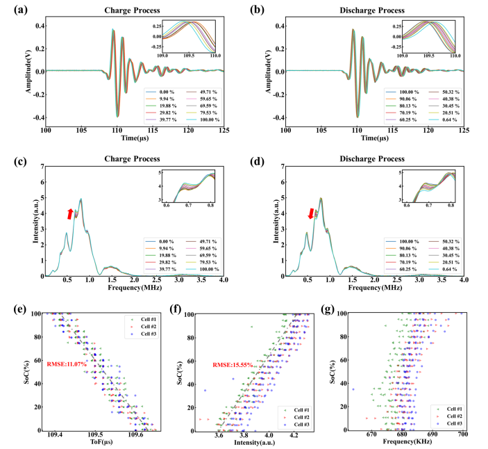 图1. SoC与声学之间的响应。(a,b )在充放电过程中,穿过不同荷电状态下的1号锂离子电池的超声信号在时域上的表现; (c, d)在频域上的表现; (e)在1号,2号和3号电池上,SoC与超声信号飞行时间之间的相关性;(f,g)SoC 与0.7 MHz附近的肩峰强度(f)和肩峰频率(g)之间的相关性。