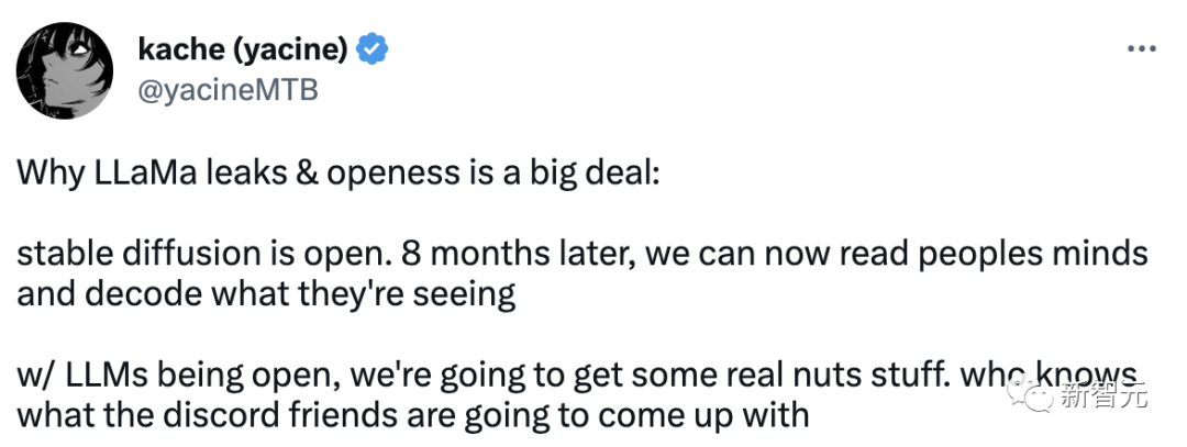 一些客户认为这是一个更好的模型,它恰好击中了他们以每年25万美元的价格出售访问权的商业计划的核心。访问他们的服务一个月可以购买一台能够运行这种泄露模型的机器。Meta削弱了一个潜在的新贵竞争对手,以保持当前的大型科技卡特尔稳定。也许这有点阴谋论,但我们生活在大科技和大阴谋的时代。周一,Meta称,尽管LLaMA已经泄露给未经授权的用户,仍将继续向认可的研究人员发布其人工智能工具。有网友直接称,自己下载了70亿参数的LLaMA,尽管不知道如何运行,万一以后用上就能拿来了。Stable Diffusion开源了。8个月后,我们现在就可以读懂别人的思想,解码他们看到的一切。随着LLMs的开放,我们将得到一些真正的疯狂的东西。