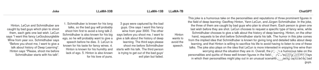 PaLM原始论文中展示了一个非常酷的用例:给定一个笑话,让模型解释它为什么好笑。这个任务需要把尝试和逻辑结合起来,PaLM之前的所有模型都无法做到这一点。将其中一些笑话交给LLaMA和ChatGPT来解释,有些笑话语言模型能get到,比如Schimidhuber冗长无聊的发言。