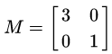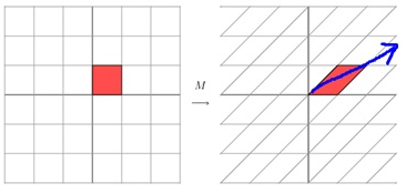 上面的矩阵是对称的,所以这个变换是一个对x、y轴的方向一个拉伸变换(每一个对角线上的元素将会对一个维度进行拉伸变换,当值大于1时是拉伸,当值小于1时是缩短),如图2所示。当矩阵不是对称的时候,假如说矩阵是下面的样子: