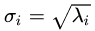 通过上面*式的证明,我们还可以看出,特征值矩阵等于奇异值矩阵的平方,也就是说特征值和奇异值满足如下关系: