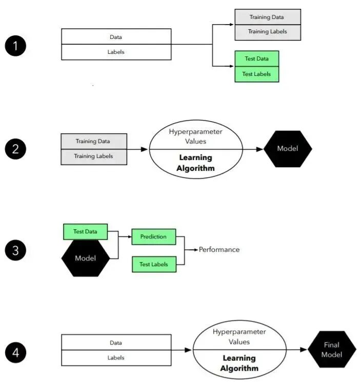 图 4:在 MNIST 数据集上 softmax 分类器的学习曲线。几乎所有机器学习算法都需要我们机器学习研究者和从业者指定大量设置。这些超参数帮助我们控制机器学习算法在优化性能、找出偏差方差最佳平衡时的行为。用于性能优化的超参数调整本身就是一门艺术,没有固定规则可以保证在给定数据集上的性能最优。前面的章节提到了用于评估模型泛化性能的留出技术和 bootstrap 技术。偏差-方差权衡和计算性能估计的不稳定性方法都得到了介绍。本章主要介绍用于模型评估和选择的不同交叉验证方法,包括对不同超参数配置的模型进行排序和评估其泛化至独立数据集的性能。本章生成图像的代码详见:https://github.com/rasbt/model-eval-article-supplementary/blob/master/code/resampling-and-kfold.ipynb。我们可以把超参数调整(又称超参数优化)和模型选择的过程看作元优化任务。当学习算法在训练集上优化目标函数时(懒惰学习器是例外),超参数优化是基于它的另一项任务。这里,我们通常想优化性能指标,如分类准确度或接受者操作特征曲线(ROC 曲线)下面积。超参数调整阶段之后,基于测试集性能选择模型似乎是一种合理的方法。但是,多次重复使用测试集可能会带来偏差和最终性能估计,且可能导致对泛化性能的预期过分乐观,可以说是「测试集泄露信息」。为了避免这个问题,我们可以使用三次分割(three-way split),将数据集分割成训练集、验证集和测试集。对超参数调整和模型选择进行训练-验证可以保证测试集「独立」于模型选择。这里,我们再回顾一下性能估计的「3 个目标」:图 12:超参数调整中三路留出方法(three-way holdout method)图示。