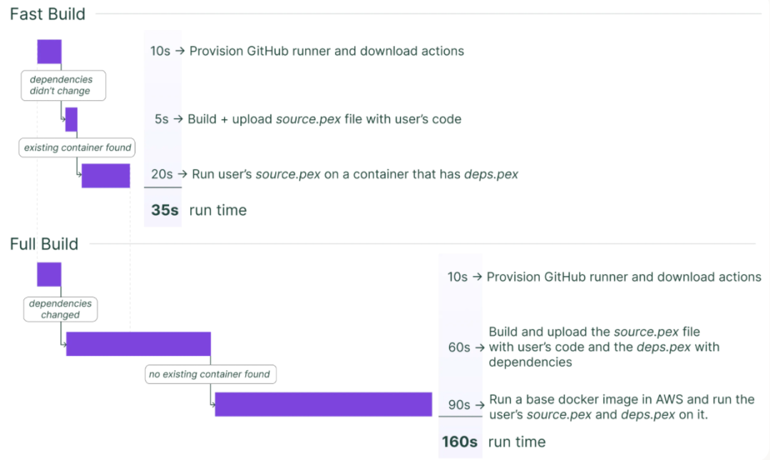 我们的系统是这样工作的:当你向 GitHub 提交代码时,GitHub Action 要么进行完全构建,要么进行快速构建,这取决于你的依赖关系自上次部署后是否有变化。我们跟踪 setup.py 和 requirements.txt 中指定的依赖项。