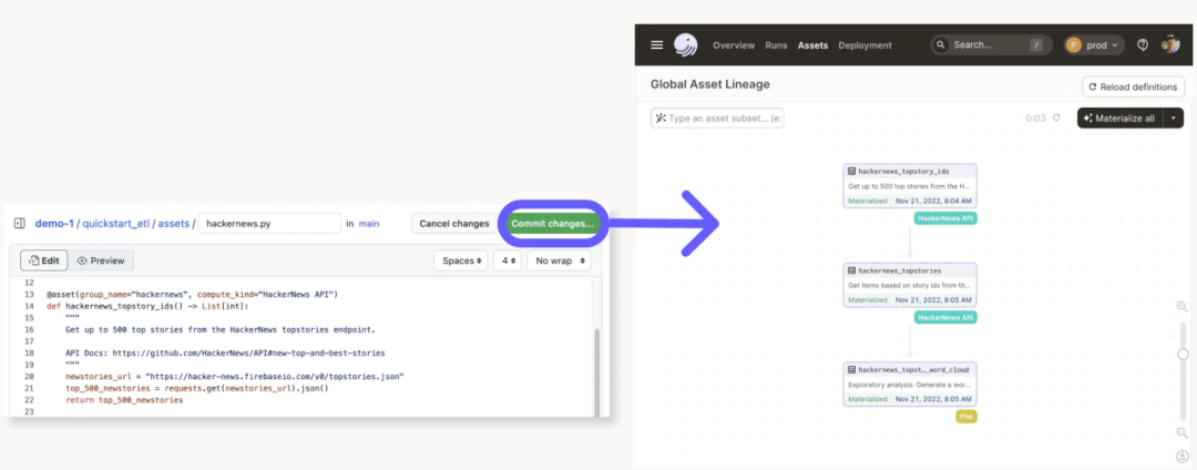 在 Docker 镜像建立和启动后,我们运行用户的代码来提取元数据,显示在用户界面上。这一步无法避免,可能需要几秒钟到30秒,甚至更久,这取决于元数据的计算方式(比如它可以连接到数据库来读取模式)。这个代码服务器保持活动状态,为元数据请求提供服务,直到推送新版本的代码,然后启动一个新的容器。