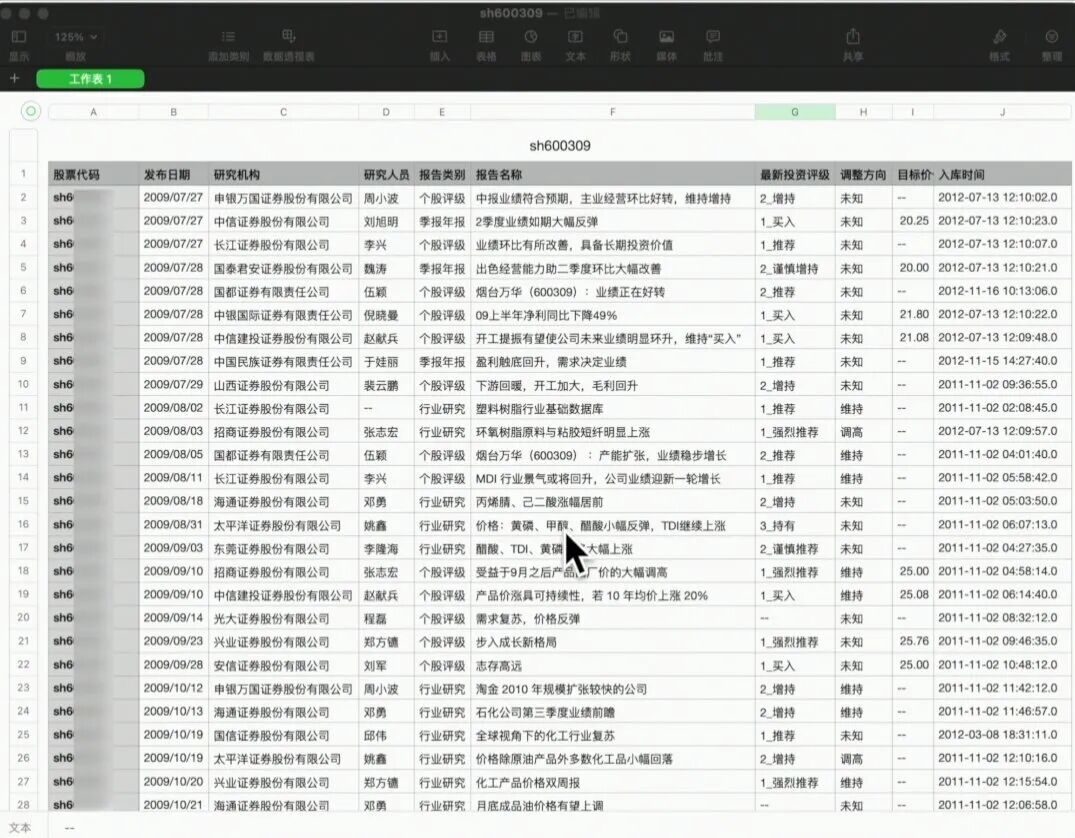 包含了2008年至今每个分析师撰写的每篇研报,涵盖了研报发布日期、推荐的股票、分析师姓名及相应的评级,非常的完备。有经验的同学应该可以想见其珍贵性。