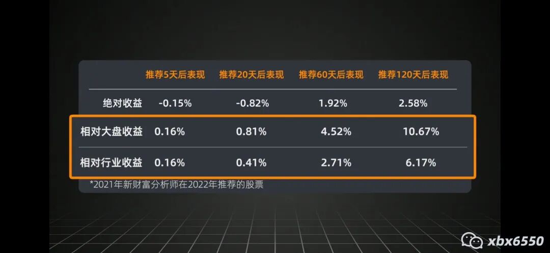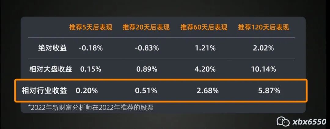 2021年新财富分析师在2022年推荐的股票未来表现如图所示: